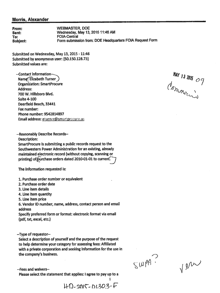 Morris, Alexander From: Sent: To: Subject: WEBMASTER, DOE Wednesday, May 13, 2015 11:46 AM FOIA Central Form submission from: DOE Headquarters FOIA Request Form Submitted on Wednesday, May 13, 2015