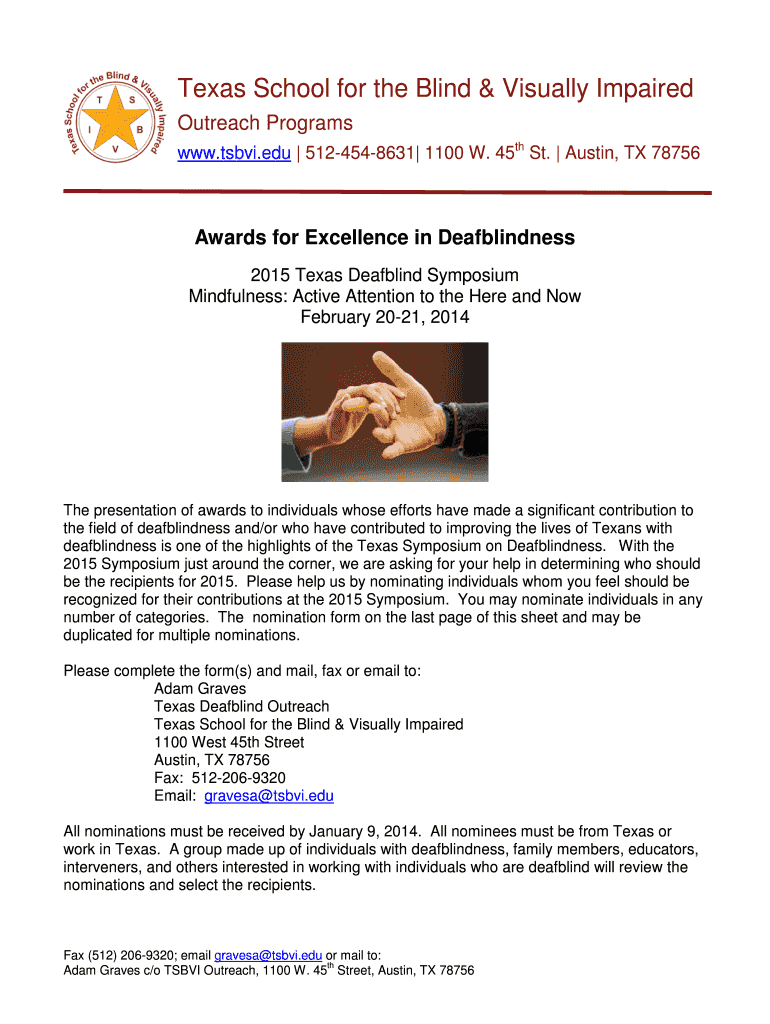 Texas School for the Blind & Visually Impaired Outreach Programs www.tsbvi.edu 5124548631 1100 W. 45th St. Austin, TX 78756 Awards for Excellence in Deaf blindness 2015 Texas Deaf blind Symposium