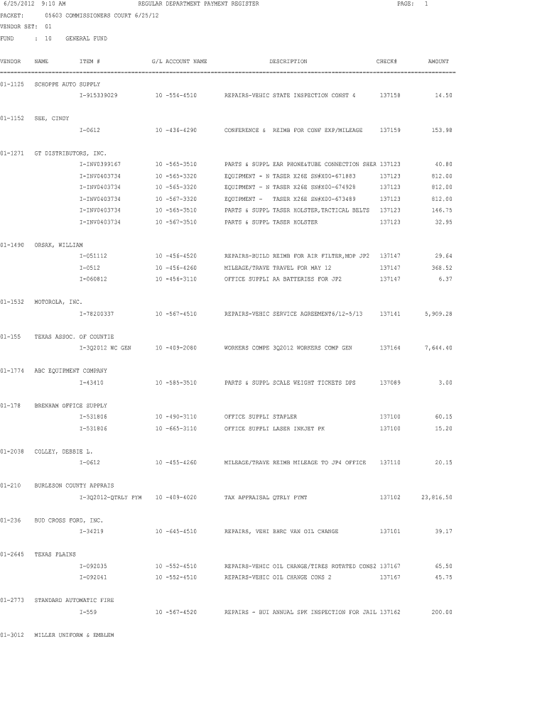 6/25/2012 9:10 AM PACKET: REGULAR DEPARTMENT PAYMENT REGISTER PAGE: 1 05603 COMMISSIONERS COURT 6/25/12 VENDOR SET: 01 FUND : 10 VENDOR NAME GENERAL FUND ITEM # G/L ACCOUNT NAME DESCRIPTION CHECK#