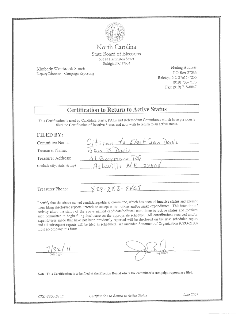 North Carolina State Board of Elections 506 N Harrington Street Raleigh, NC 27603 Nailing Address I(MB early WestbrookStrach Deputy Director PO Box 27255 Raleigh, NC 21 611.1 255 (919) 13371.13 Fax: