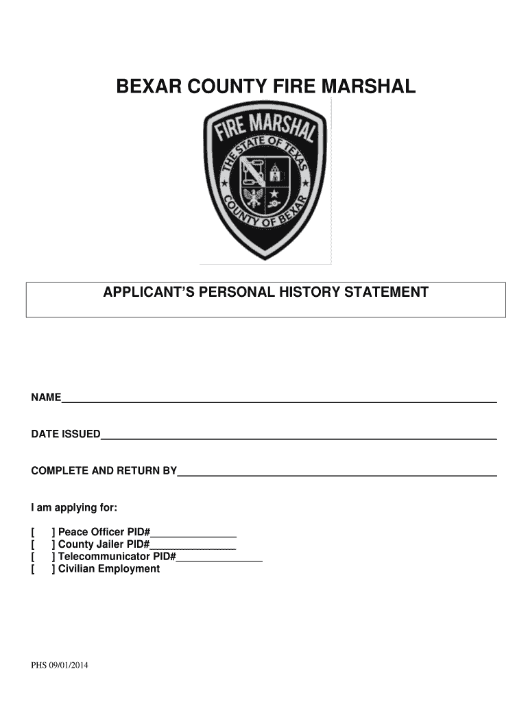 BEXAR COUNTY FIRE MARSHAL APPLICANTS PERSONAL HISTORY STATEMENT NAME DATE ISSUED COMPLETE AND RETURN BY I am applying for: Peace Officer PID# County Jailer PID# Telecommunication PID# Civilian Employment