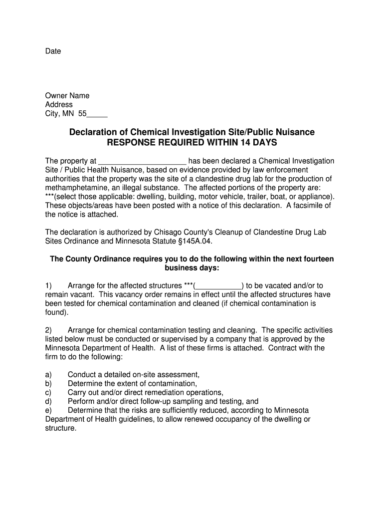 Date Owner Name Address City, MN 55 Declaration of Chemical Investigation Site/Public Nuisance RESPONSE REQUIRED WITHIN 14 DAYS The property at has been declared a Chemical Investigation Site / Public