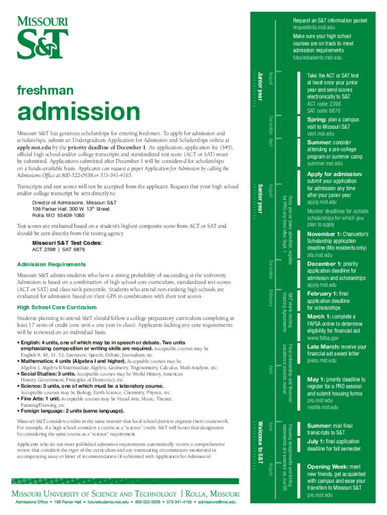 This document provides information regarding admission requirements, application deadlines, important dates, and contact details for Missouri University of Science and Technology.