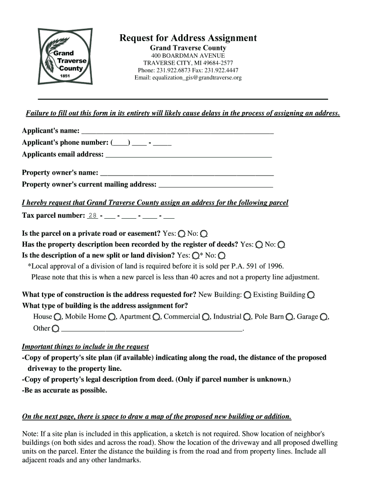 Request for Address Assignment Grand Traverse County 400 BOARDMAN AVENUE TRAVERSE CITY, MI 496842577 Phone: 231.922.6873 Fax: 231.922.4447 Email: equalization GIS grand traverse.org Failure to fill