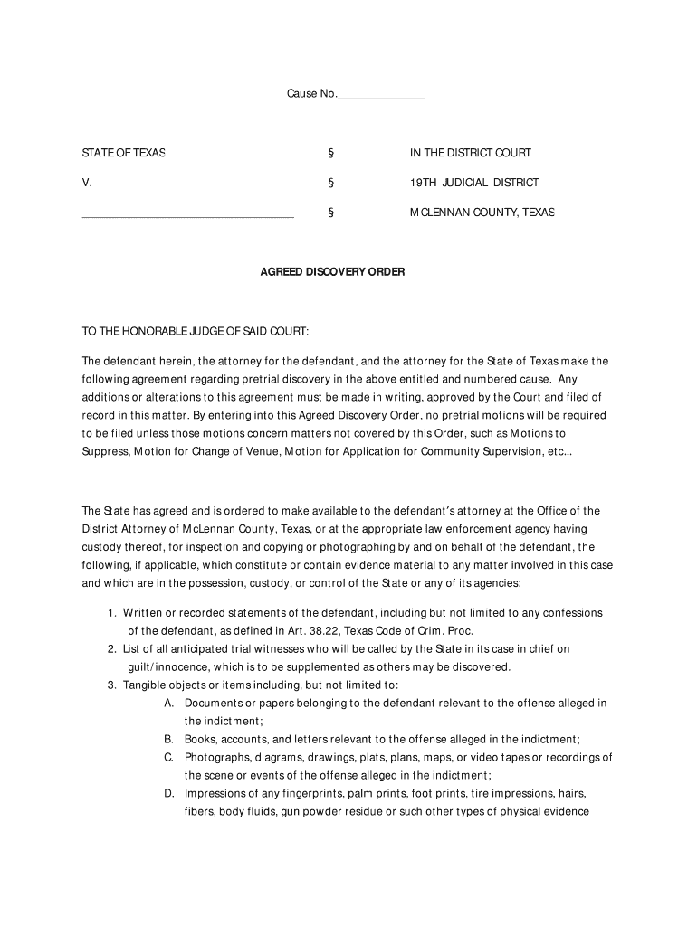 Cause No. STATE OF TEXAS IN THE DISTRICT COURT V. 19TH JUDICIAL DISTRICT MCLENNAN COUNTY, TEXAS AGREED DISCOVERY ORDER TO THE HONORABLE JUDGE OF SAID COURT: The defendant herein, the attorney for