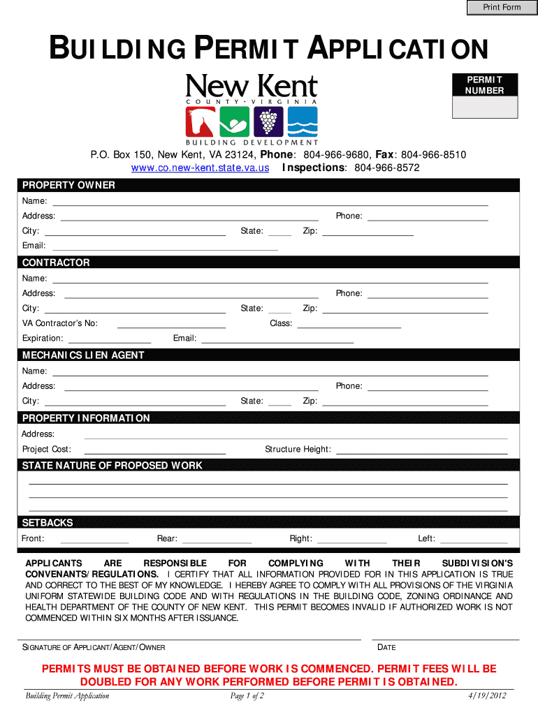 Print Form BUILDING PERMIT APPLICATION PERMIT NUMBER P.O. Box 150, New Kent, VA 23124, Phone: 8049669680, Fax: 8049668510 www.co.newkent.state.va.us Inspections: 8049668572 PROPERTY OWNER Name: Address: