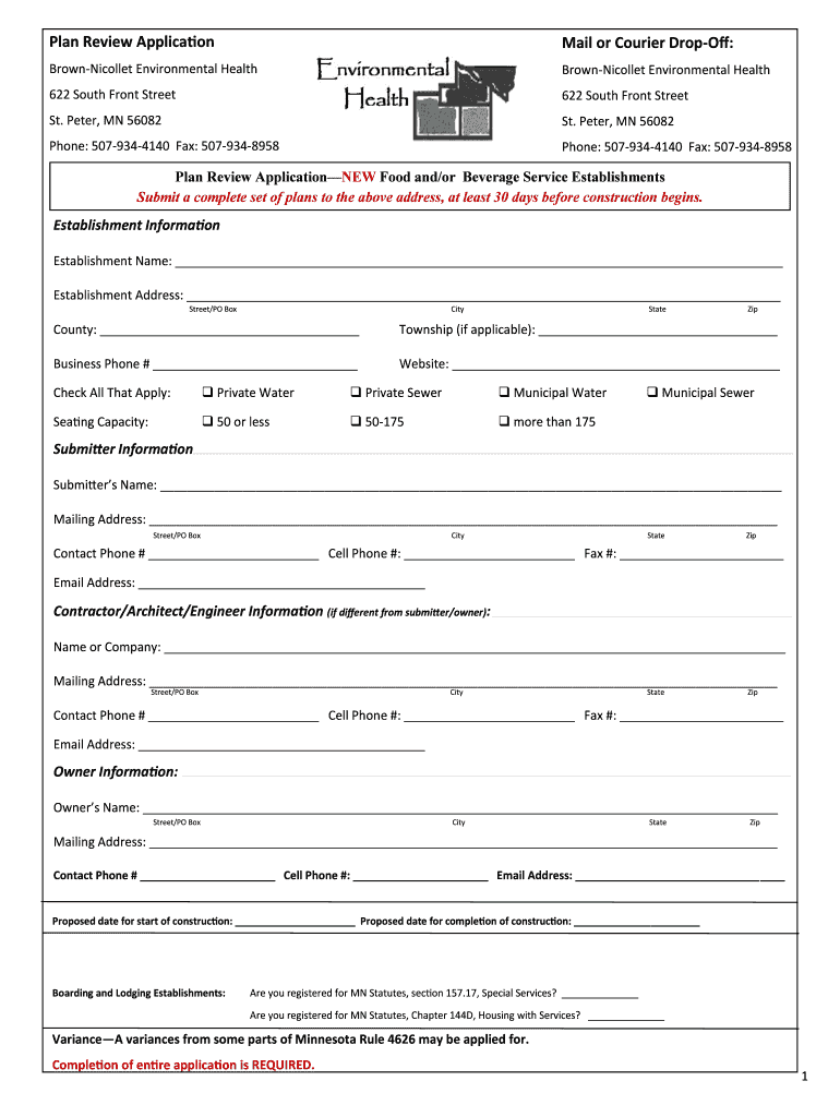 Plan Review Application Mail or Courier Drop-off: BrownNicollet Environmental Health BrownNicollet Environmental Health 622 South Front Street 622 South Front Street St. Peter, MN 56082 St. Peter,