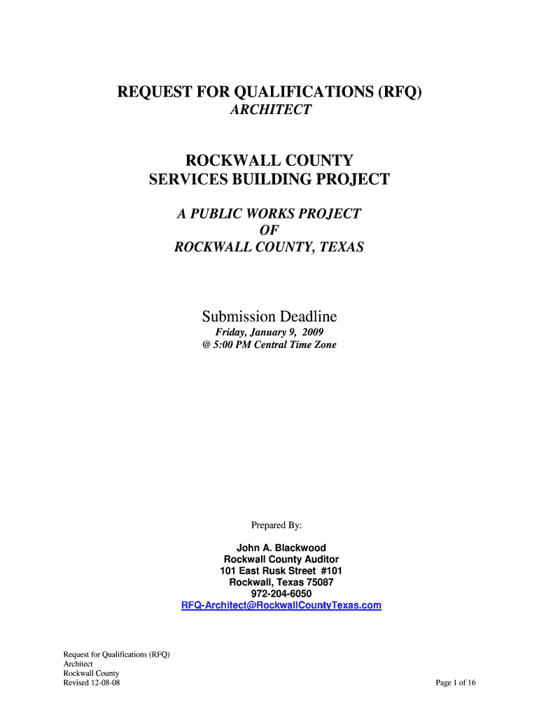 REQUEST FOR QUALIFICATIONS (RFQ) ARCHITECT ROCKWELL COUNTY SERVICES BUILDING PROJECT A PUBLIC WORKS PROJECT OF ROCKWELL COUNTY, TEXAS Submission Deadline Friday, January 9, 2009 5:00 PM Central Time