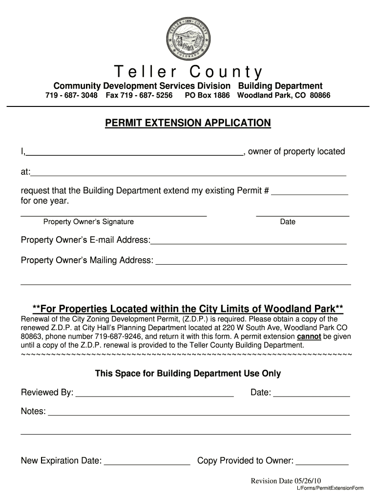 Teller County Community Development Services Division Building Department 719 687 3048 Fax 719 687 5256 PO Box 1886 Woodland Park, CO 80866 PERMIT EXTENSION APPLICATION I, owner of property located