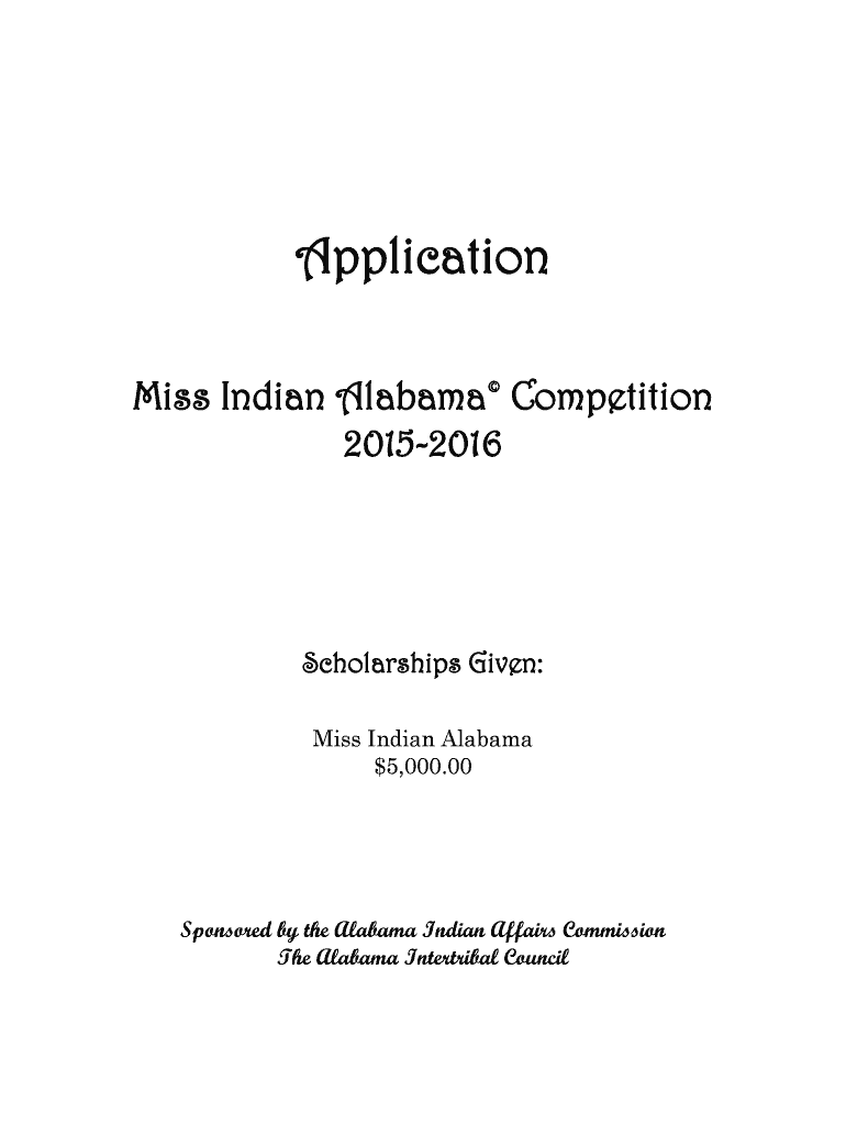Application Miss Indian Alabama Competition 20152016 Scholarships Given: Miss Indian Alabama $5,000.00 Sponsored by the Alabama Indian Affairs Commission The Alabama Intertribal Council ELIGIBILITY