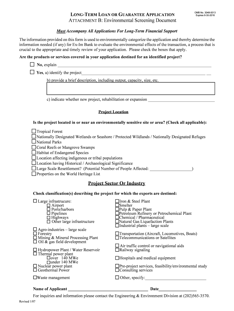LONGER LOAN OR GUARANTEE APPLICATION ATTACHMENT B: Environmental Screening Document OMB No. 30480013 Expires 6302016 Must Accompany All Applications For Longer Financial Support The information provided