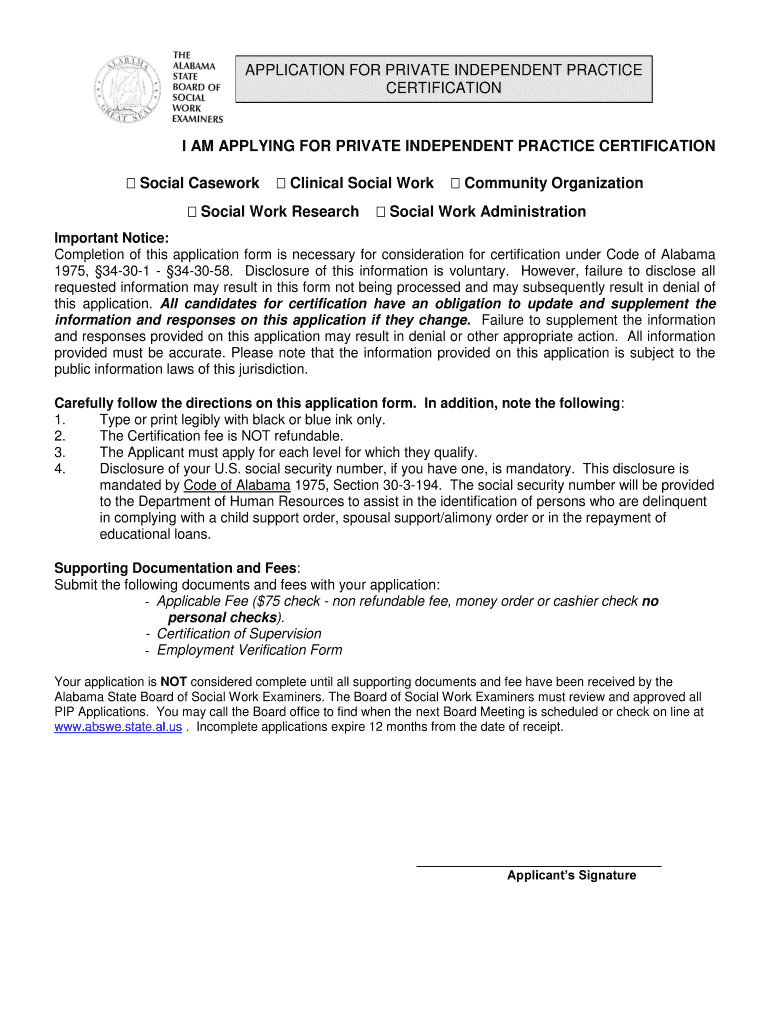 APPLICATION FOR PRIVATE INDEPENDENT PRACTICE CERTIFICATION I AM APPLYING FOR PRIVATE INDEPENDENT PRACTICE CERTIFICATION Social Casework Clinical Social Work Research Community Organization Social