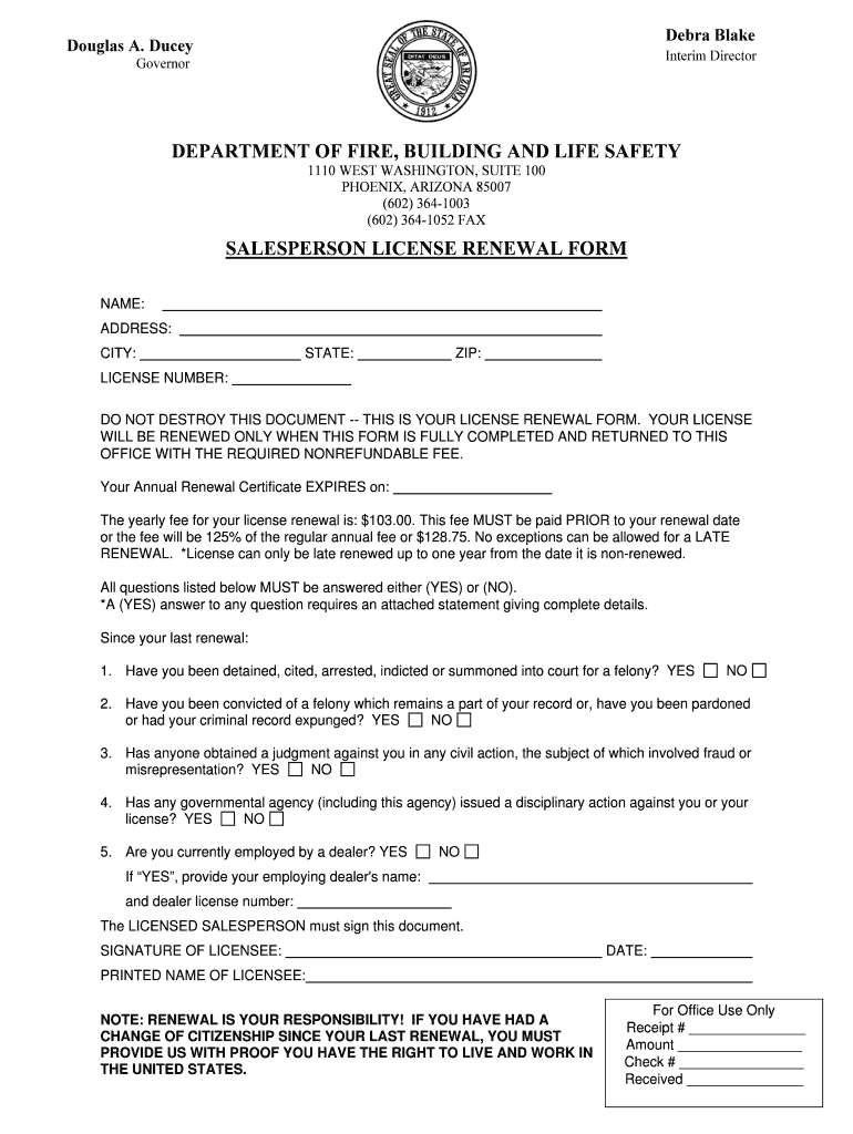 Get the free Salesperson License Renewal Form REVISED 1-2015 - dfbls az