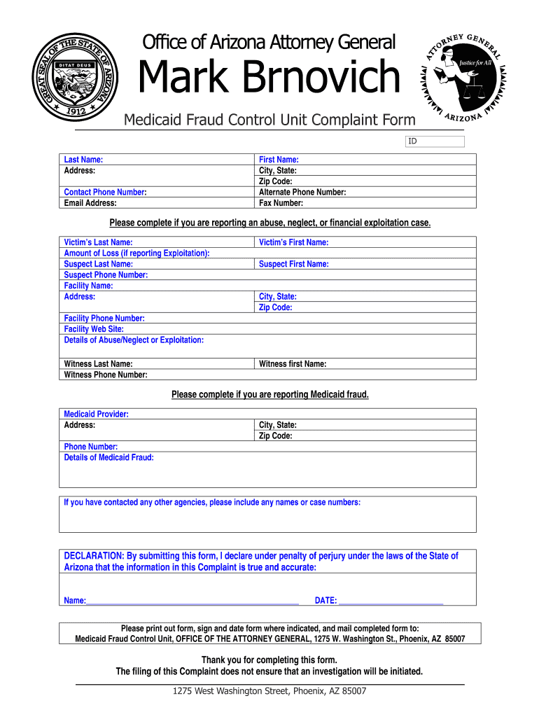 Office of Arizona Attorney General Mark Novice Your Information (items in BLUE are required) Medicaid Fraud Control Unit Complaint Form Last Name: First Name: Your Information (items in BLUE are required)