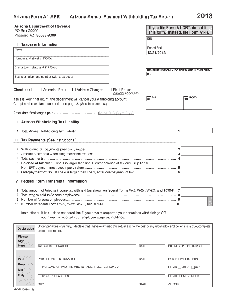 Arizona Form A1APR 2013 Arizona Annual Payment Withholding Tax Return Arizona Department of Revenue PO Box 29009 Phoenix AZ 850389009 If you file Form A1QRT, do not file this form. Instead, file Form
