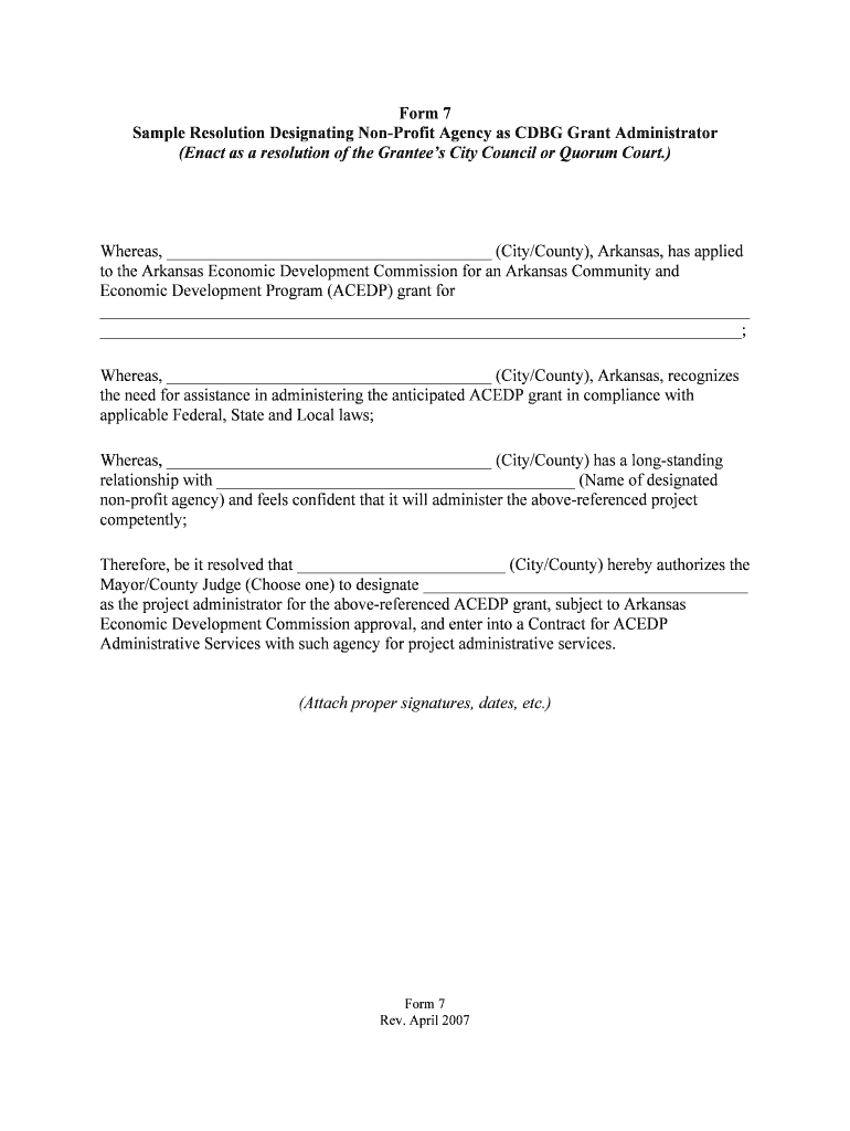 Form 7 Sample Resolution Designating Nonprofit Agency as CBG Grant Administrator (Enact as a resolution of the Grantees City Council or Quorum Court.) Whereas, (City/County), Arkansas, has applied