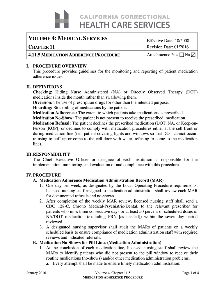 Revision Date: 01/20164.11.5 MEDICATION ADHERENCE PROCEDUREAttachments: Yes. PROCEDURE OVERVIEW