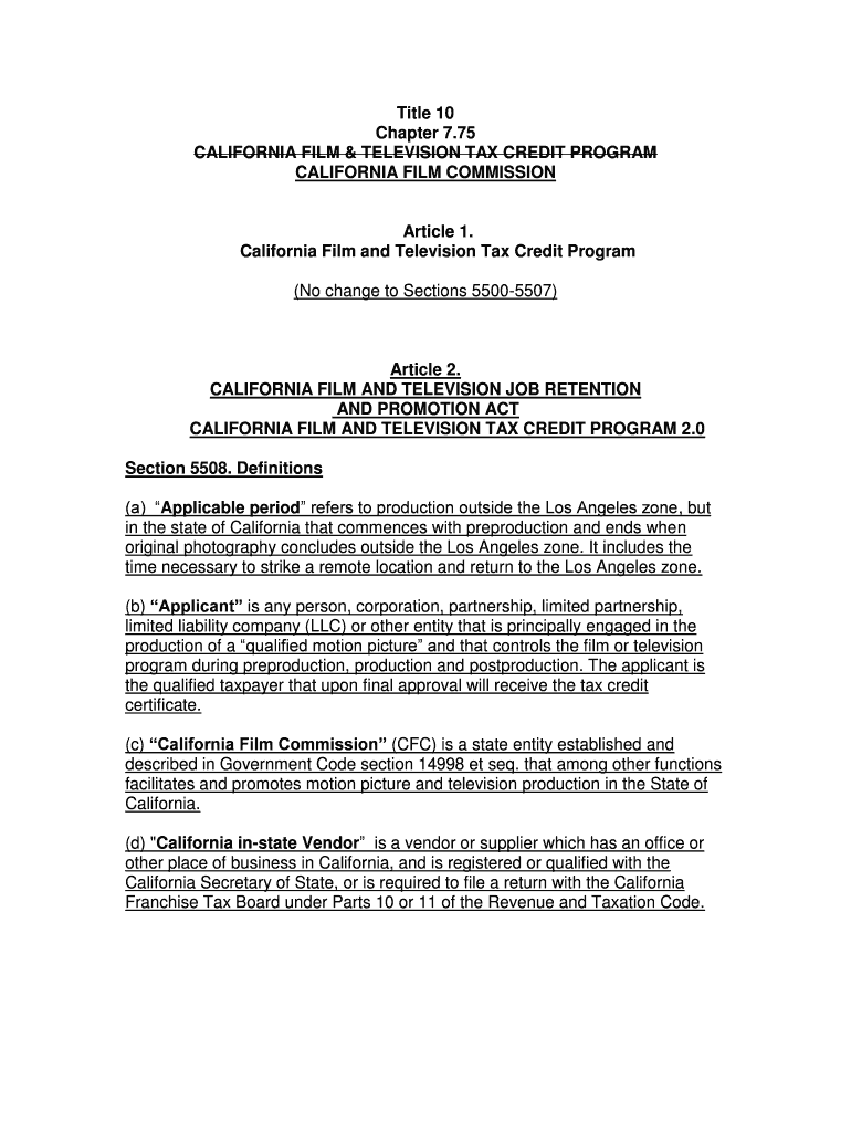 Title 10 Chapter 7.75 CALIFORNIA FILM & TELEVISION TAX CREDIT PROGRAM CALIFORNIA FILM COMMISSION Article 1. California Film and Television Tax Credit Program (No change to Sections 55005507) Article