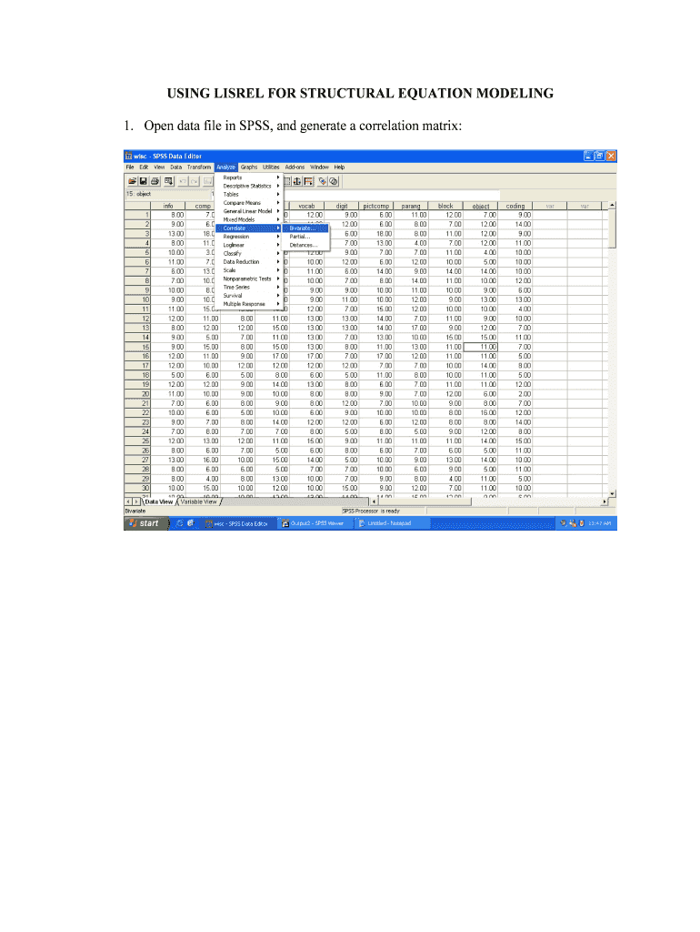 1. Open data file in SPSS, and generate a correlation matrix:2. Once you have the output, cut and paste it to the Notepad utility (this will remove