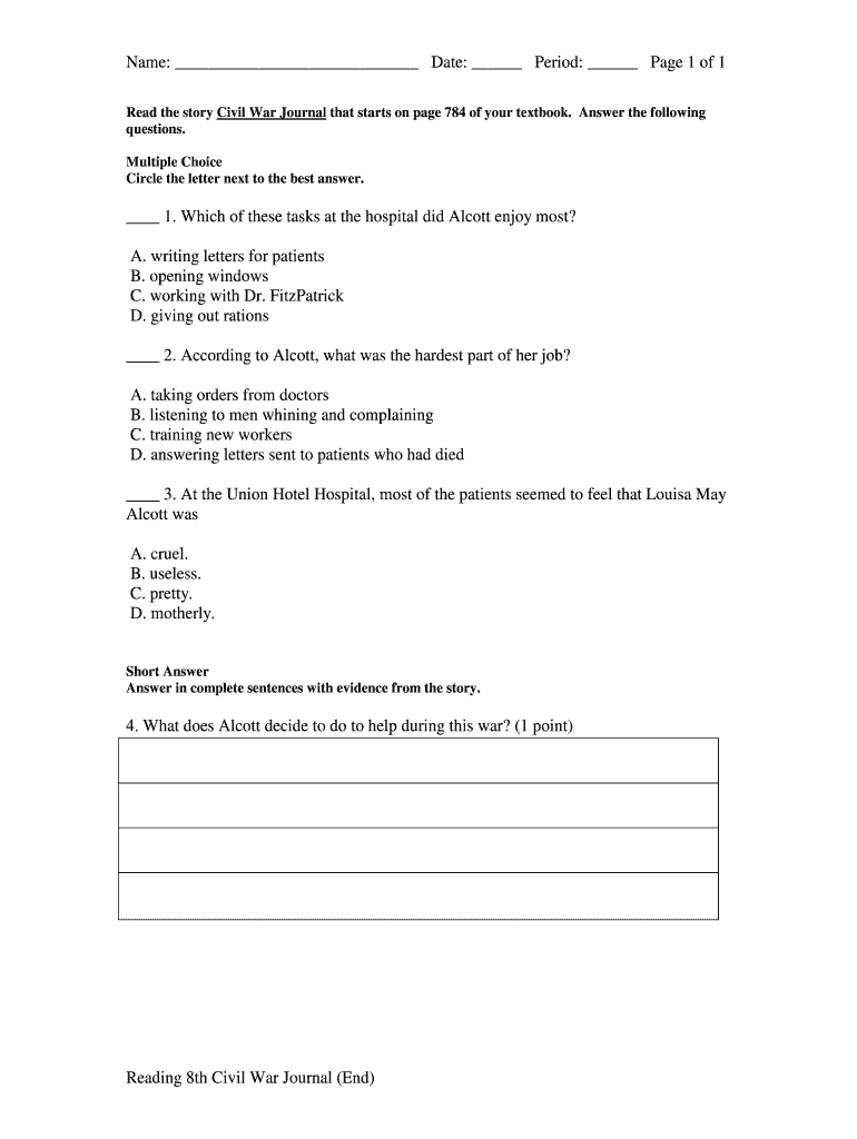 Name: Date: Period: Page 1 of 1 Read the story Civil War Journal that starts on page 784 of your textbook. Answer the following questions. Multiple Choice Circle the letter next to the best answer.