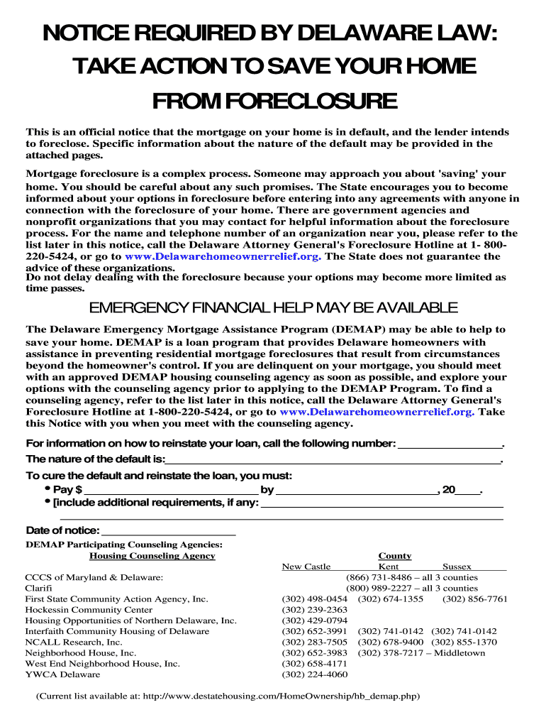NOTICE REQUIRED BY DELAWARE LAW: TAKE ACTION TO SAVE YOUR HOME FROM FORECLOSURE This is an official notice that the mortgage on your home is in default, and the lender intends to foreclose. Specific