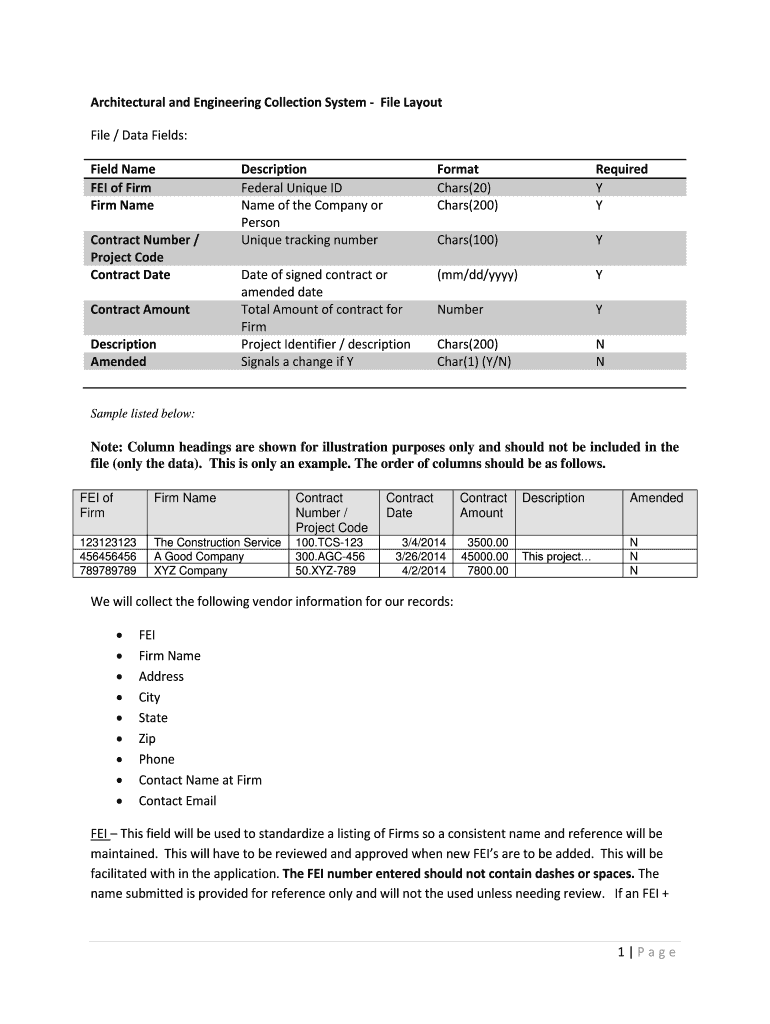 Architectural and Engineering Collection System File Layout File / Data Fields: Field Name FEI of Firm Name Contract Number / Project Code Contract Date Contract Amount Description Amended Description