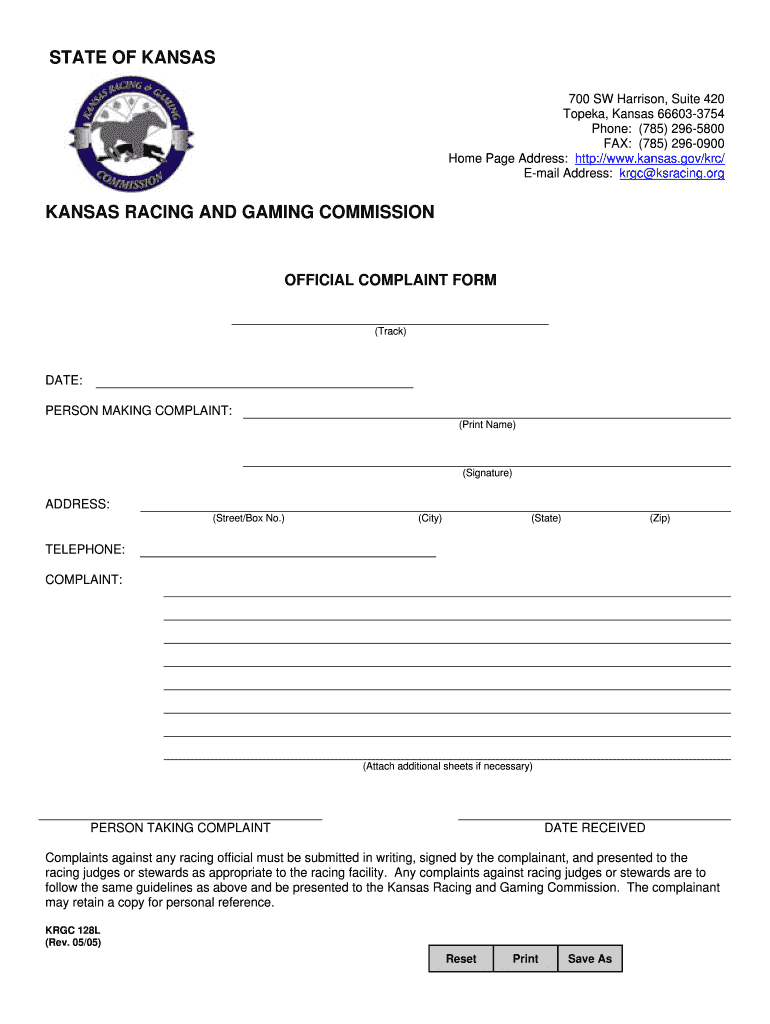 The official complaint form for the Kansas Racing and Gaming Commission (KRGC) is a document used to report violations or concerns related to gaming and racing activities.