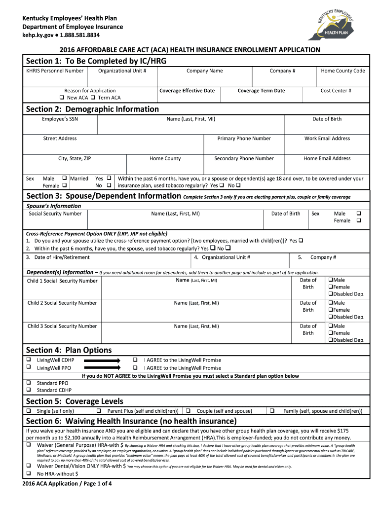 Kentucky Employees Health Plan Department of Employee Insurance keep.KY.gov 1.888.581.8834 2016 AFFORDABLE CARE ACT (ACA) HEALTH INSURANCE ENROLLMENT APPLICATION Section 1: To Be Completed by IC/HOG