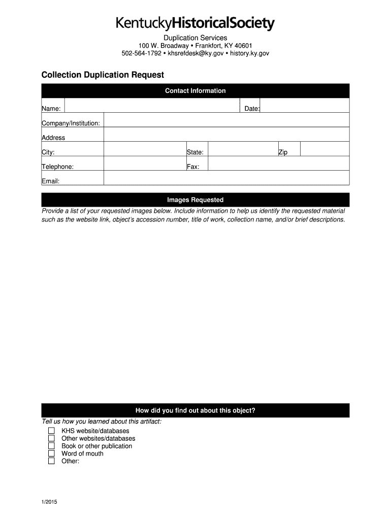 Duplication Services 100 W. Broadway Frankfort, KY 40601 5025641792 khsrefdesk KY.gov history.KY.gov Collections Duplication Request Use this form to request a quote for high resolution, quality digital