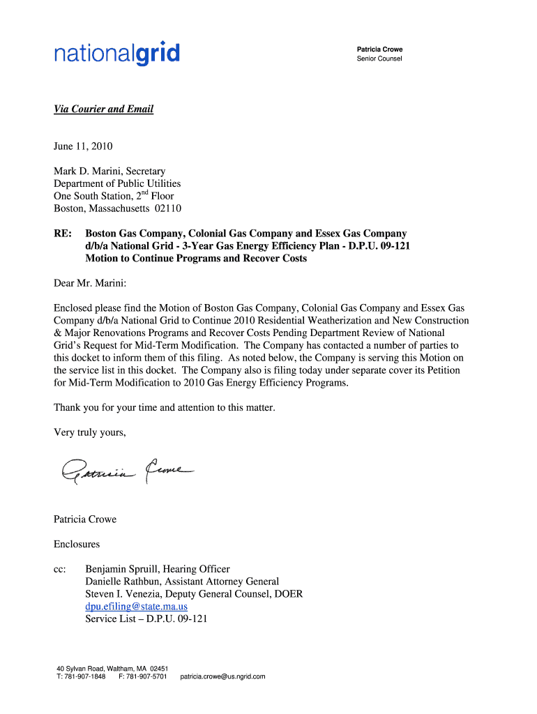Patricia Crowe Senior Counsel Via Courier and Email June 11, 2010, Mark D. Marine, Secretary Department of Public Utilities One South Station, 2nd Floor Boston, Massachusetts 02110 RE: Boston Gas