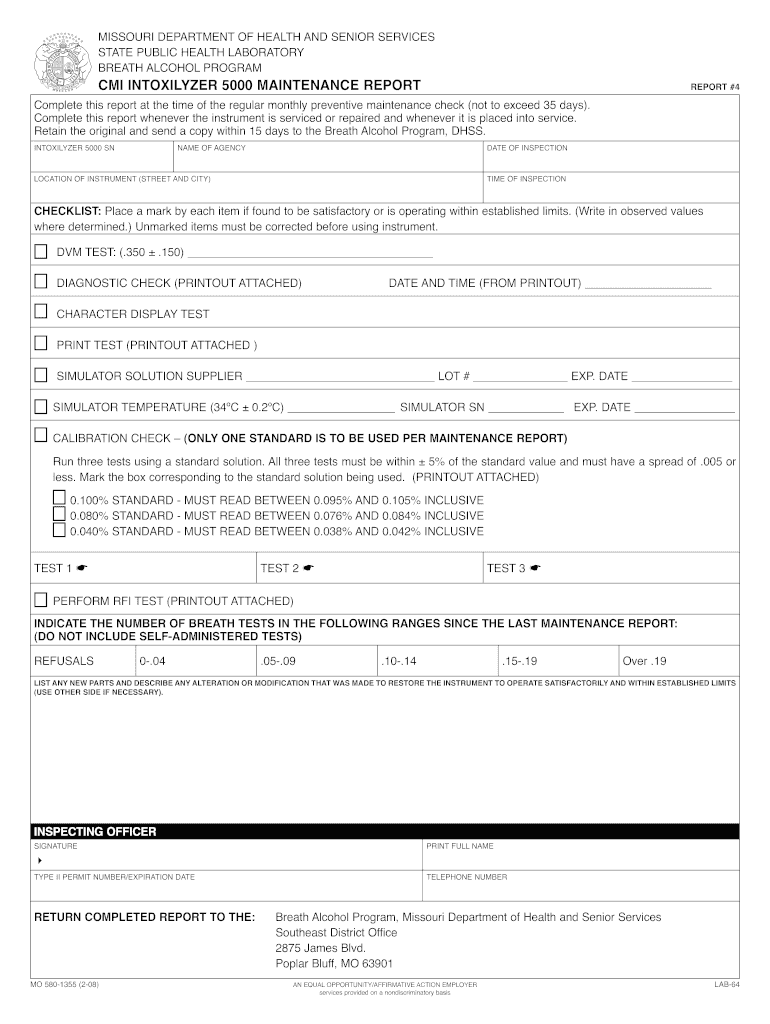 Save MISSOURI DEPARTMENT OF HEALTH AND SENIOR SERVICES STATE PUBLIC HEALTH LABORATORY BREATH ALCOHOL PROGRAM Print CMI INTOXILYZER 5000 MAINTENANCE REPORT Reset REPORT #4 Complete this report at the