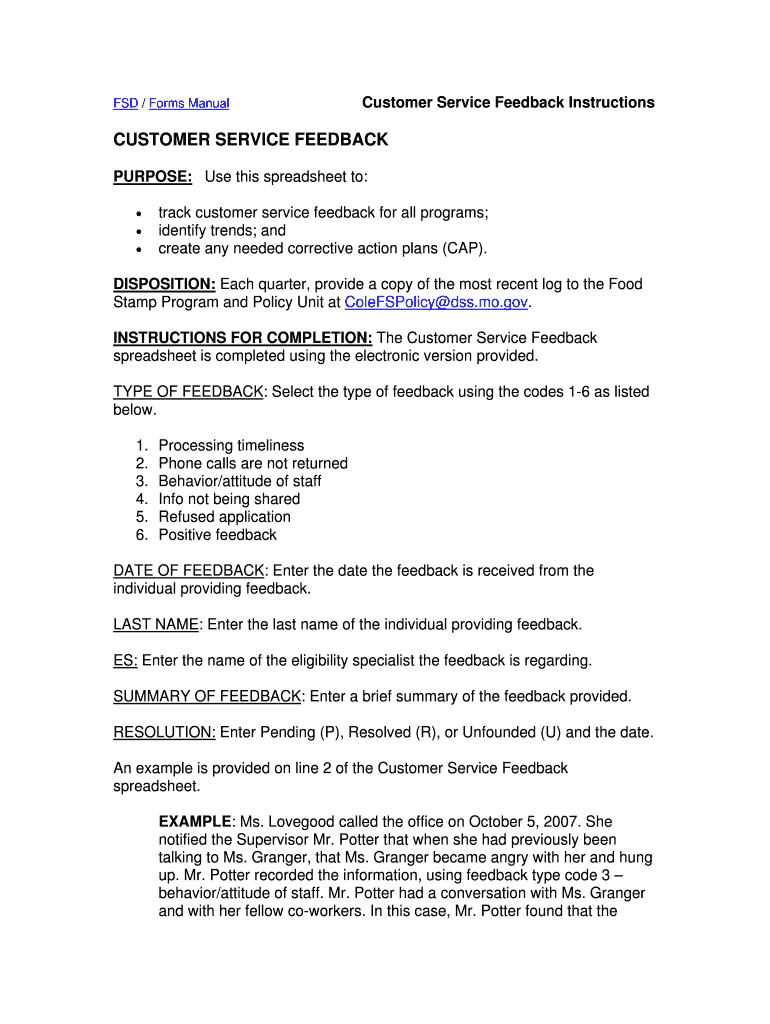 FSD / Forms Manual Customer Service Feedback Instructions CUSTOMER SERVICE FEEDBACK PURPOSE: Use this spreadsheet to: track customer service feedback for all programs; identify trends; and create