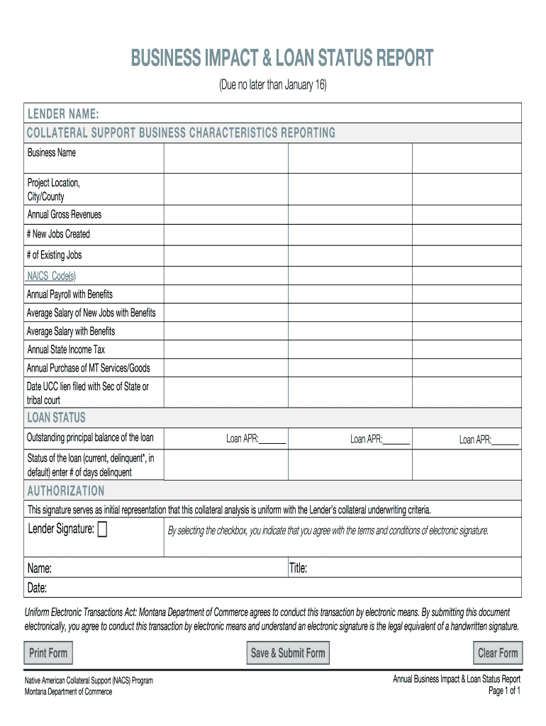 BUSINESS IMPACT & LOAN STATUS REPORT (Due no later than January 16) LENDER NAME: COLLATERAL SUPPORT BUSINESS CHARACTERISTICS REPORTING Business Name Project Location, City/County Annual Gross Revenues