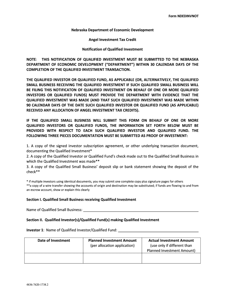FormNDEDINVNOT NebraskaDepartmentofEconomicDevelopment AngelInvestmentTaxCredit NotificationofQualifiedInvestment NOTE: THIS NOTIFICATION OF QUALIFIED INVESTMENT MUST BE SUBMITTED TO THE NEBRASKA