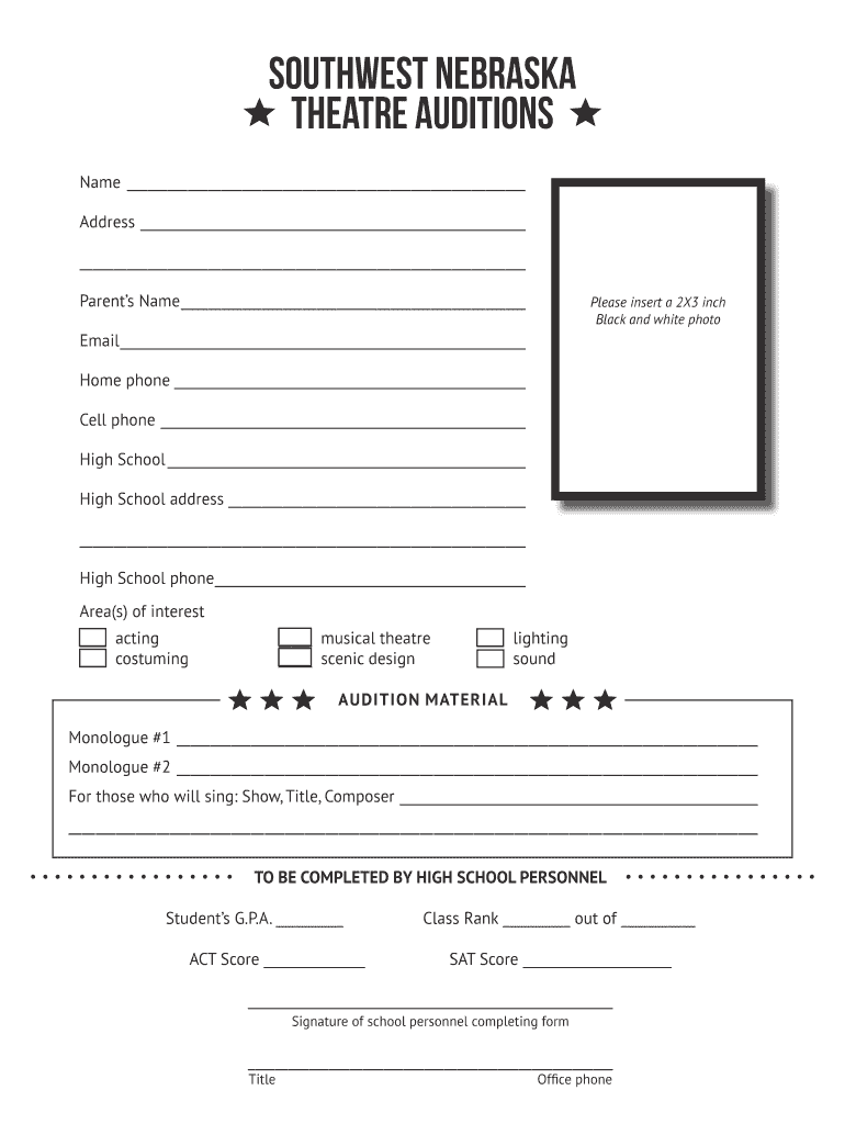 Southwest Nebraska Theater Auditions Name Address Parents Name Please insert a 2×3 inch Black and white photo Email Home phone Cell phone High School address High School phone Area(s) of interest