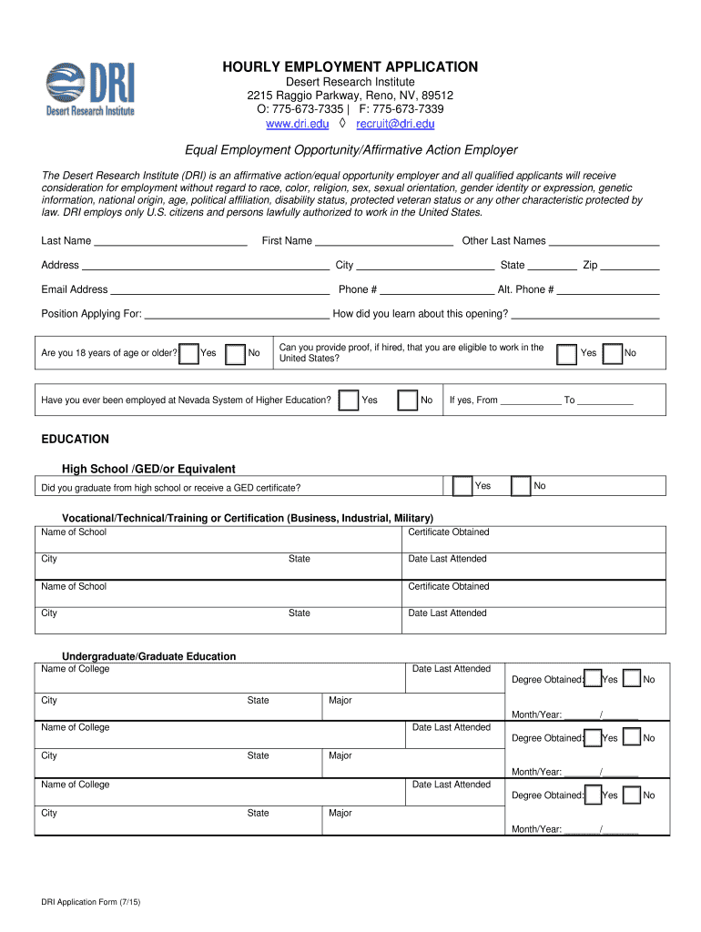 Get the free HOURLY EMPLOYMENT APPLICATION Desert Research Institute O - dri