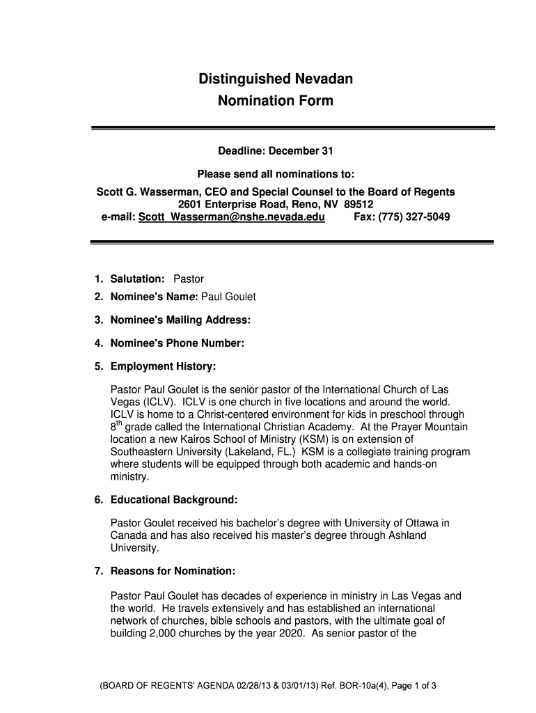 Distinguished Nevadan Nomination Form Deadline: December 31 Please send all nominations to: Scott G. Wasserman, CEO and Special Counsel to the Board of Regents 2601 Enterprise Road, Reno, NV 89512