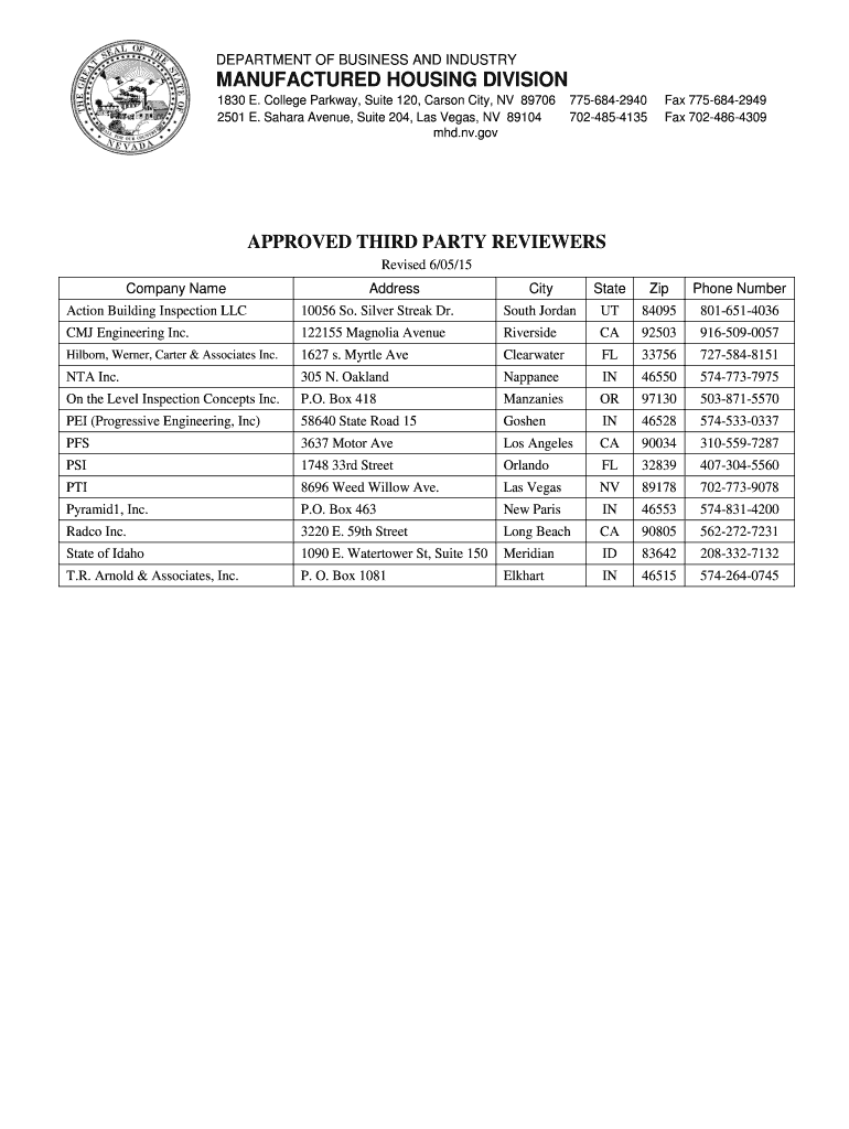DEPARTMENT OF BUSINESS AND INDUSTRY MANUFACTURED HOUSING DIVISION 1830 E. College Parkway, Suite 120, Carson City, NV 89706 2501 E. Sahara Avenue, Suite 204, Las Vegas, NV 89104 MHD.NV.gov 7756842940