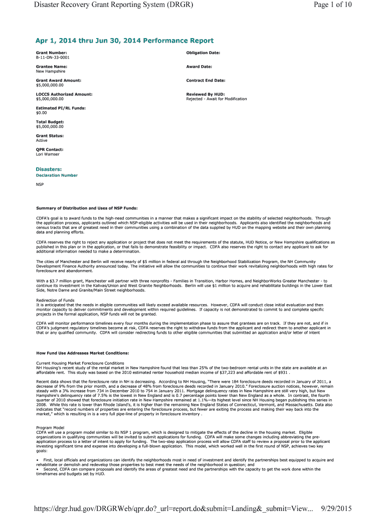 Disaster Recovery Grant Reporting System (DRG) Page 1 of 10 Apr 1, 2014 through Jun 30, 2014 Performance Report Grant Number: B11DN330001 Obligation Date: Grantee Name: New Hampshire Award Date: Grant