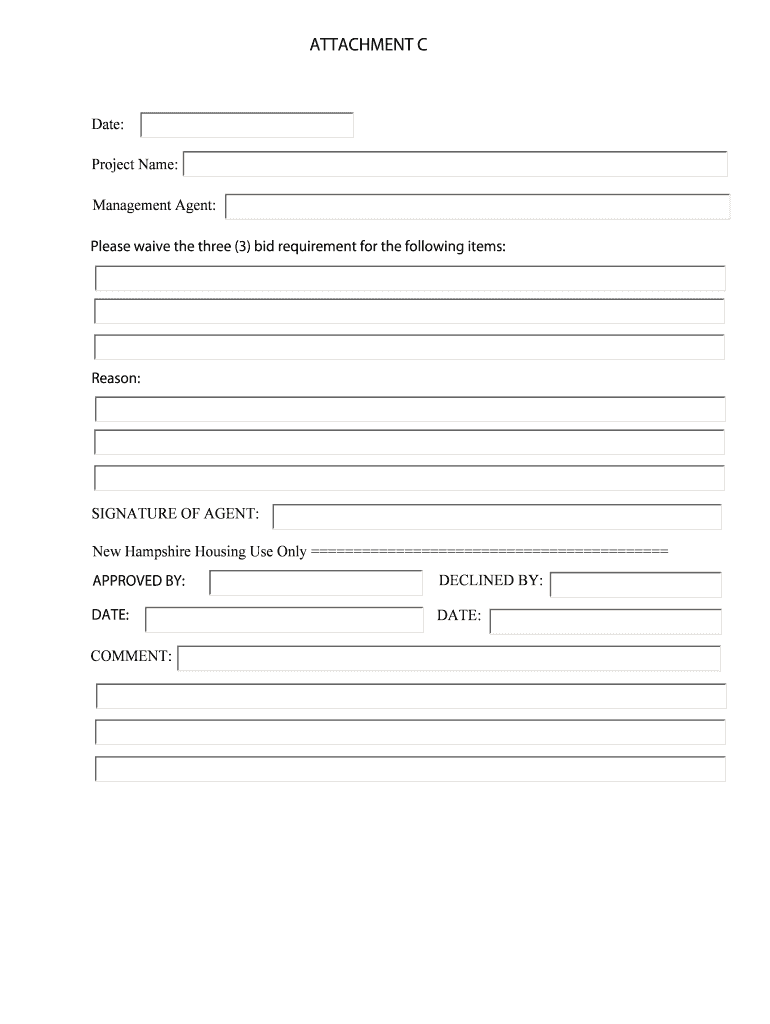 ATTACHMENT C Date: Project Name: Management Agent: Please waive the three (3) bid requirement for the following items: Reason: SIGNATURE OF AGENT: New Hampshire Housing Use Only APPROVED BY: DECLINED