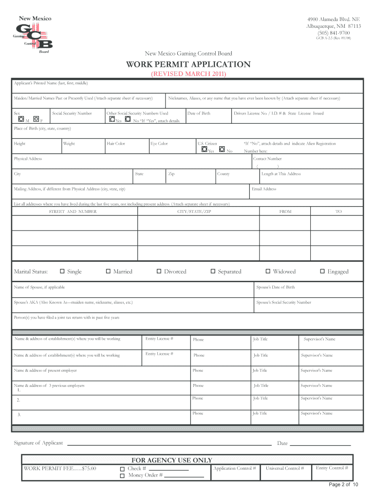 $75 application fee for a three-year Universal Gaming Work Permit ... Letter from NM GCB Executive Director signed by applicant to acknowledge receipt.