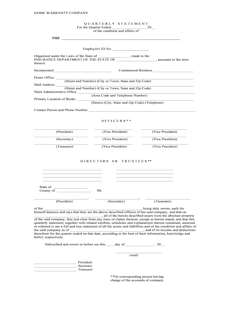 HOME WARRANTY COMPANY QUARTERLY STATEMENT For the Quarter Ended 20 of the condition and affairs of THE Employer's ID No: Organized under the Laws of the State of, made to the INSURANCE DEPARTMENT