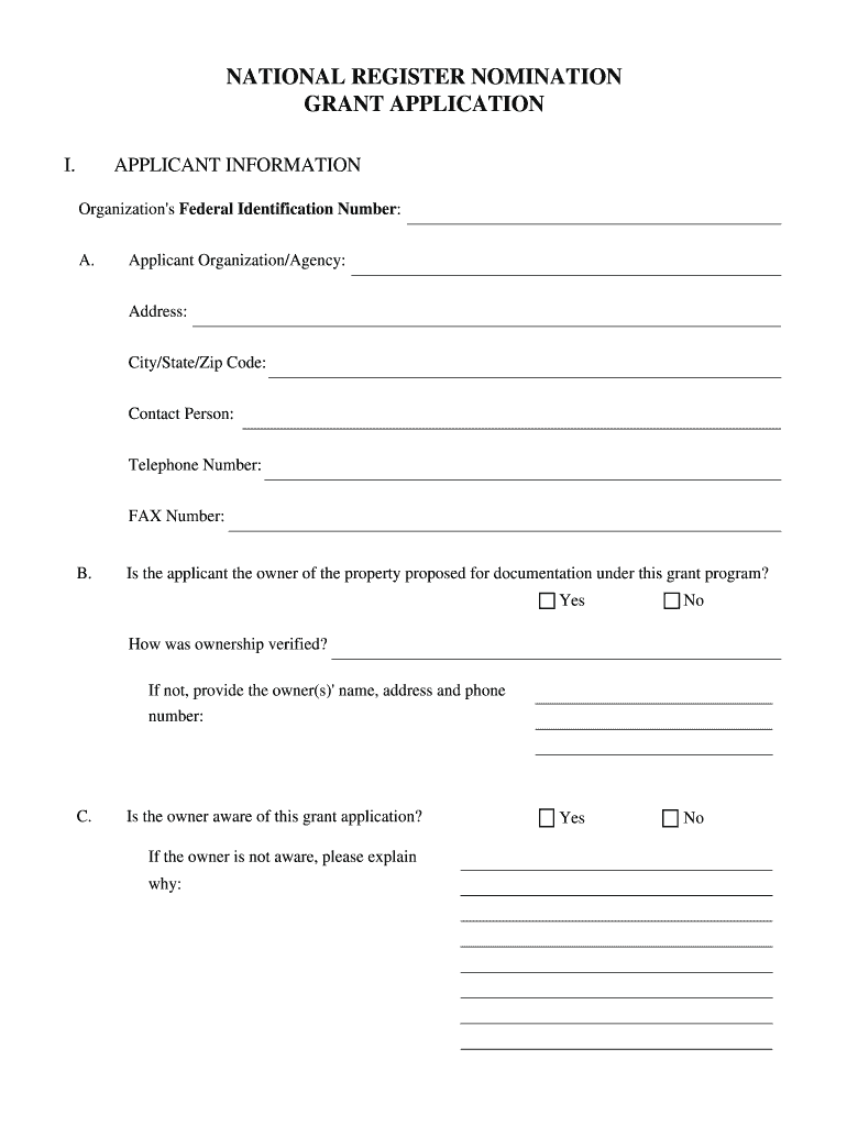 NATIONAL REGISTER NOMINATION GRANT APPLICATION I. APPLICANT INFORMATION Organization's Federal Identification Number: A. Applicant Organization/Agency: Address: City/State/Zip Code: Contact Person: