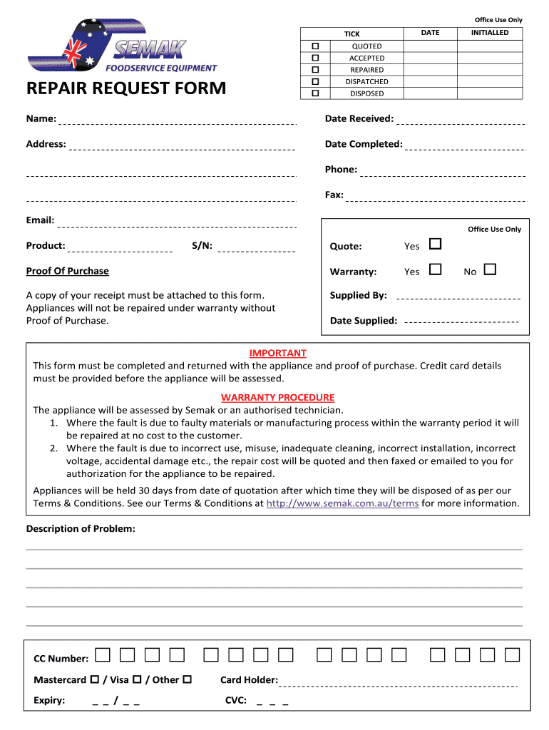 Office Use Only DATE TICK REPAIR REQUEST FORM INITIALED QUOTED ACCEPTED REPAIRED DISPATCHED DISPOSED Name: Date Received: Address: Date Completed: Phone: Fax: Email: Office Use Only Product: S/N: