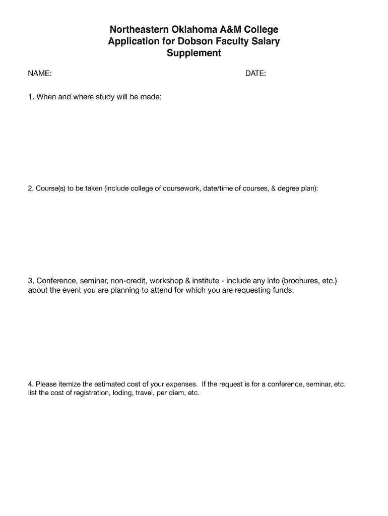 Northeastern Oklahoma A&M College Application for Dobson Faculty Salary Supplement NAME: DATE: 1. When and where study will be made: 2. Course(s) to be taken (include college of coursework, date/time