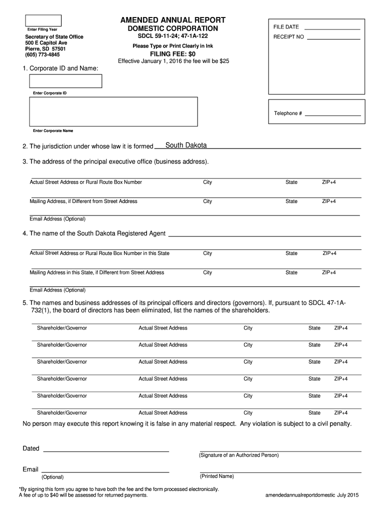 AMENDED ANNUAL REPORT Enter Filing Year Secretary of State Office 500 E Capitol Ave Pierre, SD 57501 (605) 7734845 FILE DATE DOMESTIC CORPORATIONS DCL 591124; 471A122 RECEIPT NO Please Type or Print
