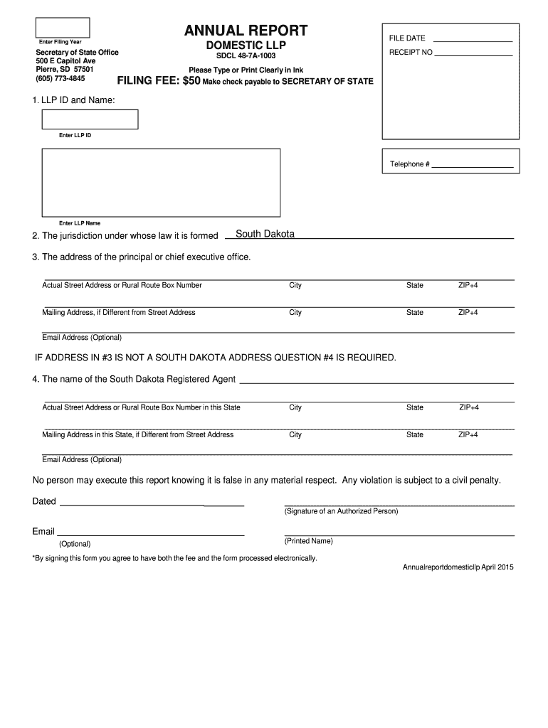 ANNUAL REPORT Enter Filing Year Secretary of State Office 500 E Capitol Ave Pierre, SD 57501 (605) 7734845 FILING DOMESTIC LLP FILE DATE RECEIPT NO DCL 487A1003 Please Type or Print Clearly in Ink