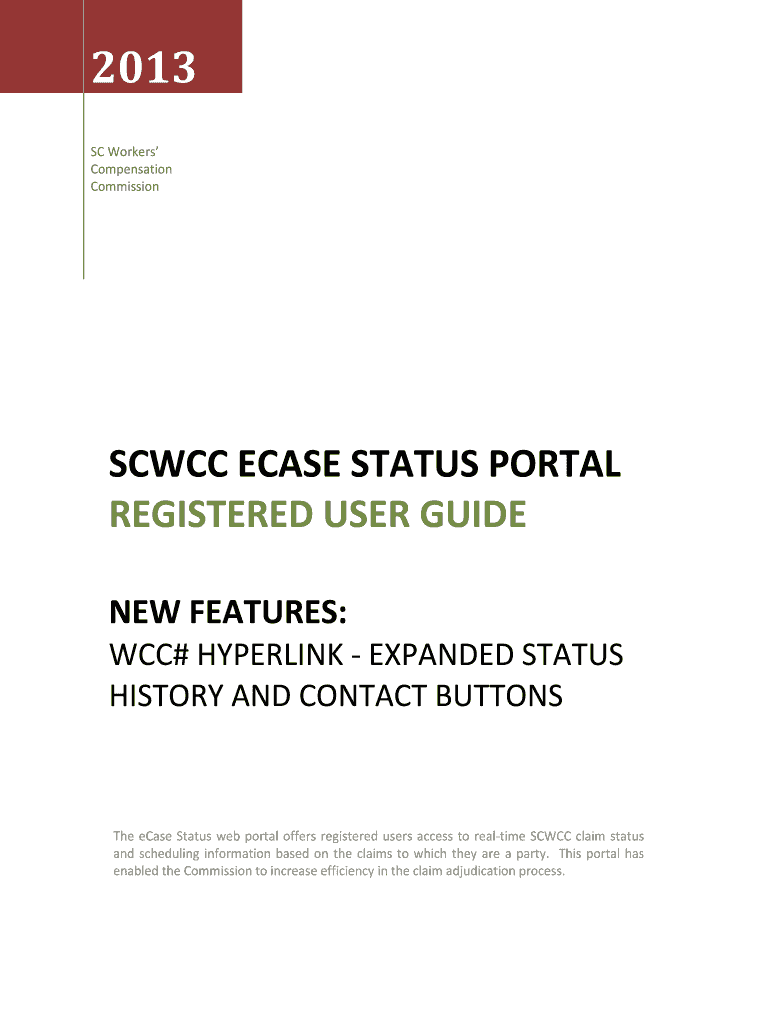 2013 SC Workers Compensation CommissionSCWCC CASE STATUS PORTAL REGISTERED USER GUIDE NEW FEATURES:WCC# HYPERLINK EXPANDED STATUS HISTORY AND CONTACT Buttons case Status web portal offers registered