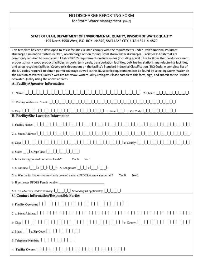 NO DISCHARGE REPORTING FORM for Storm Water Management (0815) STATE OF UTAH, DEPARTMENT OF ENVIRONMENTAL QUALITY, DIVISION OF WATER QUALITY 195 North 1950 West, P.O. BOX 144870, SALT LAKE CITY, UTAH