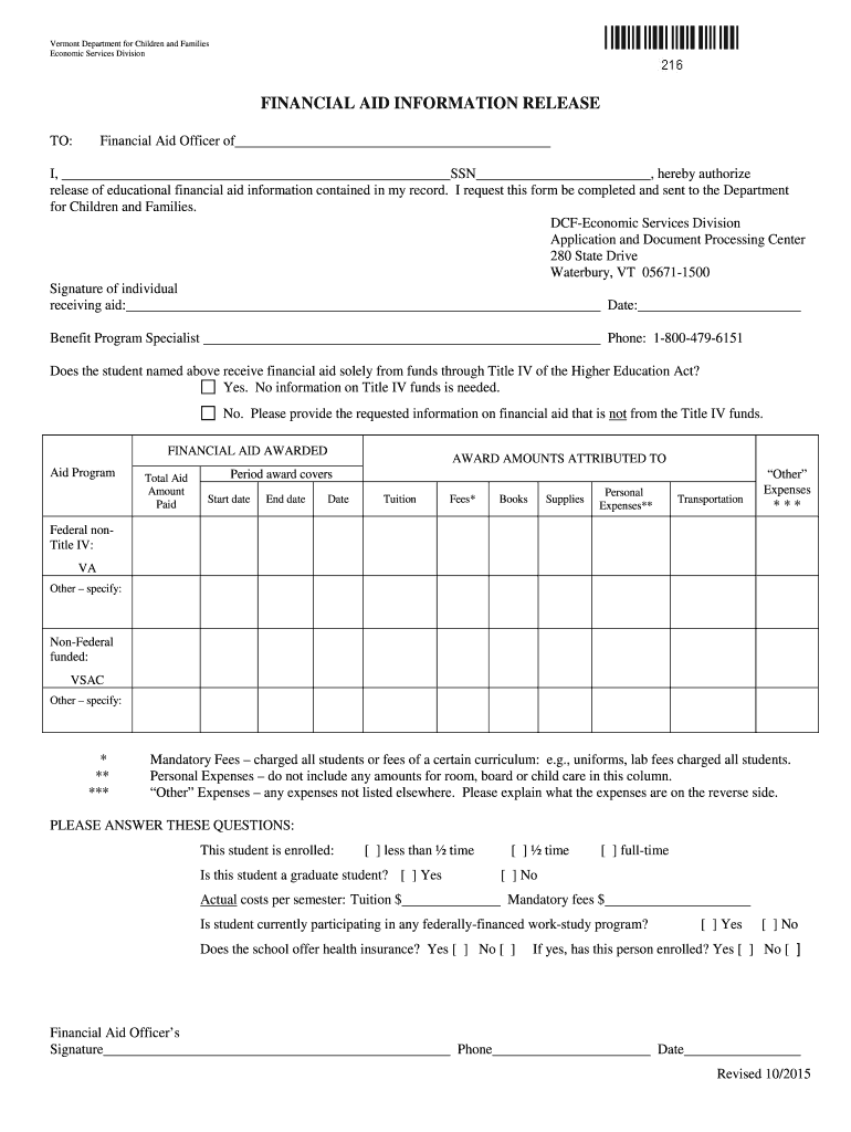 Get the free FINANCIAL AID INFORMATION RELEASE - dcfvermontgov - dcf vermont